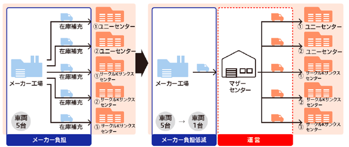 今後、取引先のメーカーはこのマザーセンターに商品を一括配送することになる。このマザーセンターから全国に32カ所あるユニー(6カ所)とサークルKサンクス(26カ所)の物流センターに仕分け・配送される。配送ラインが一本化されるため、物流コストの低減につながる。ユニーでは年間約1億円の利益改善を見込む。