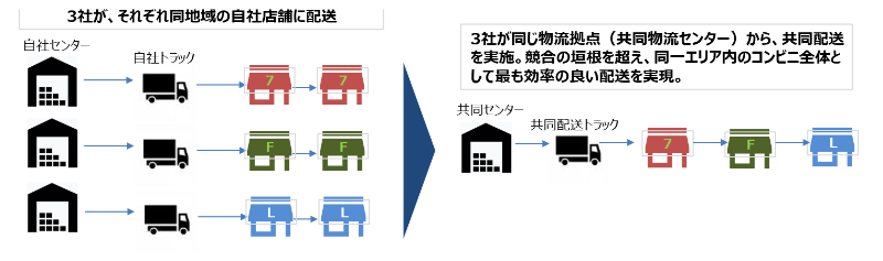 二酸化炭素排出量の削減などの社会課題を解決するため、各社ごとに最適化してきた物流網を、コンビニ3社が連携して、新たな物流の効率化・最適化を検討していく。