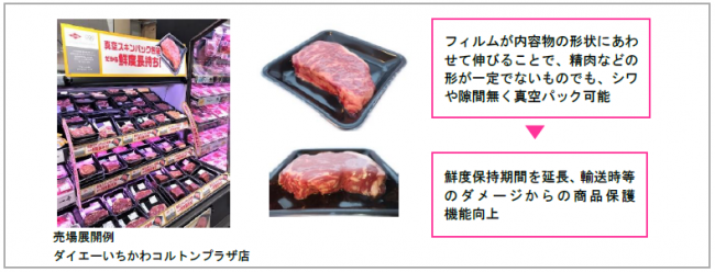 この真空スキンパック包装を使用することで鮮度保持期間が延長でき、輸送時のダメージから商品を保護できることから、食品廃棄物の削減につながることが期待される。