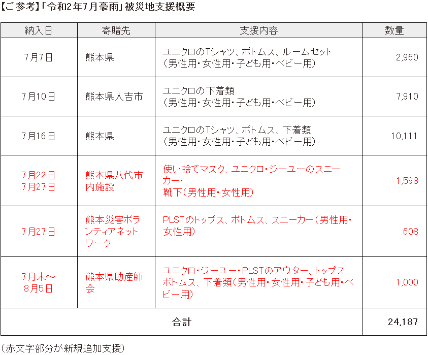 流通スーパーニュース > 戦略 > ファーストリテイリングnews|7月豪雨の熊本県被災者に第4弾支援物資 ファーストリテイリングnews|7月豪雨の熊本県被災者に第4弾支援物資 戦略 / 2020年08月07日 ツイート (株)ファーストリテイリング(山口県山口市、柳井正会長兼社長)は、「令和2年7月豪雨」で被災した熊本県内で避難生活を送っている被災者に向けた第4弾の支援物資として、使い捨てマスク、男性用・女性用・子ども用・ベビー用の衣類、スニーカーなど約3200点を寄贈した。 同社の熊本県への支援は、累計2万4000点超の衣類に上っている。 ツイート