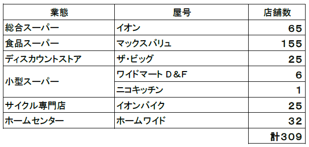 イオン九州は、総合スーパー「イオン」、食品スーパーマーケット「マックスバリュ」、ディスカウントストア「ザ・ビッグ」に加え、小型スーパー、サイクル事業、ホームセンター事業、ネットスーパーなど、さまざまな事業を展開する。総店舗数は309店となった。
