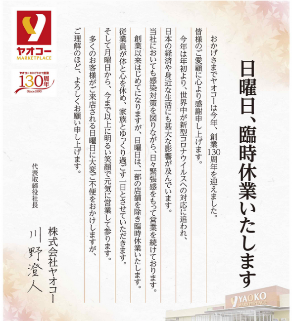 ヤオコーnews|創業130年で初めて「日曜日、臨時休業いたします」
