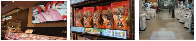 第1が、お客との新たなタッチポイントづくりのためのデジタル販促の検証。商品棚に動画配信できる「ビデオレール」を活用し、商品と販促が連動した提案を行う。また、コンテンツ内の2次元バーコードから商品やレシピ紹介、将来的にはオンラインショップへの遷移を行うことでOMO(Online Merges with Offline=オンラインとオフラインの融合)の取り組みを進めていく。また店内に設置したデジタルサイネージで商品加工や調理などのライブ配信を行うことで、非対面や非接触でも体験できる買物の楽しさを提案する。