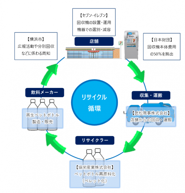 三者の役割は、横浜市が事業の周知および正しい分別について、市民への浸透を図る。日本財団は、セブン‐イレブン店頭に設置するペットボトル回収機の本体費用の50%を拠出する。セブン‐イレブン店舗は、回収機の運用および回収資源の管理を担う。また、ペットボトル回収機は(株)寺岡精工製で、500mlペットボトルで換算すると約280本を収容できる。