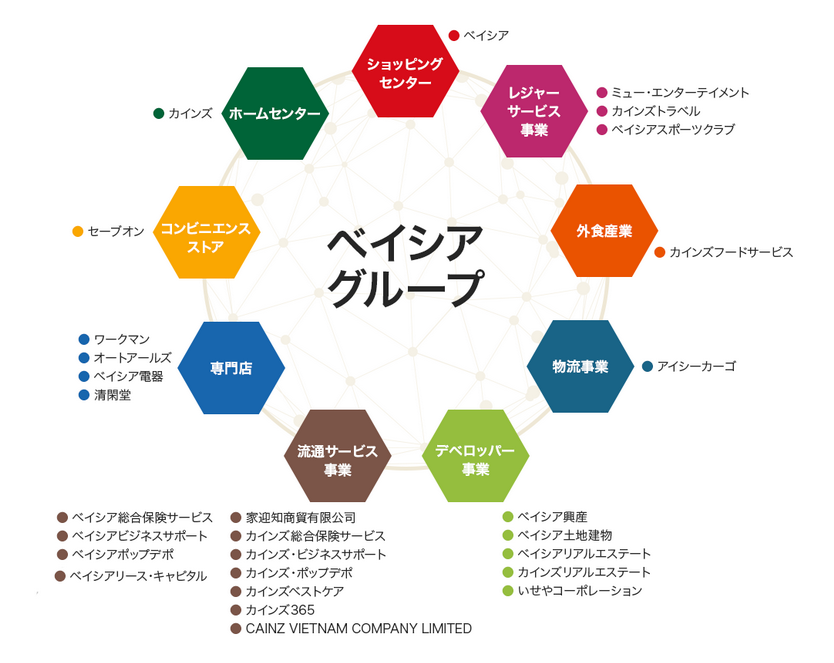 現在、総合スーパー「ベイシア」、ホームセンター「カインズ」、ワーキングウエア専門店「ワークマン」、コンビニエンスストア「セーブオン」、家電専門店「ベイシア電器」、カー用品専門店「オートアールズ」など、専門性を追求した「商のマウンテンチェーン」を形成している。
