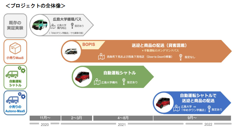 第3段階の実験では、2021年9月~2022年3月の期間、自動運転車でスーパーへの送迎と商品の宅配を同時に行う。MONETアプリで車両を予約し、モニターが指定した停留所から「ゆめタウン学園店」まで送迎する。また電話で注文した商品をモニターが指定した停留所・時間に配送する。広島大学の東広島キャンパスと「ゆめタウン学園店」を結ぶルートは停留所を10カ所予定する。対象者は西条町下見および西条下見地区の住民モニター。