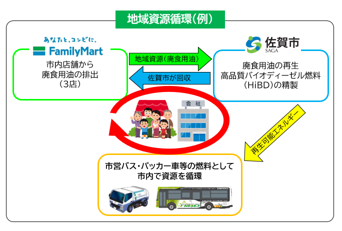 この協定に基づき、2月1日(月)から順次、佐賀市内のファミリーマート店舗で発生した廃食用油を、佐賀市が回収・精製し、佐賀市営バスなどの燃料として使用する循環型の取り組みを実施する。