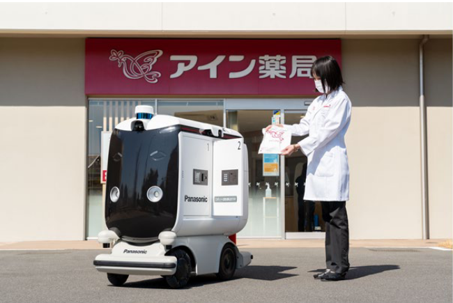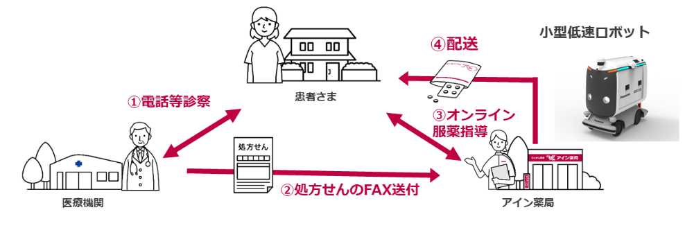 患者が電話などによって医師の診察を受け、アイン薬局の薬剤師からオンライン服薬指導を受けると、パナソニックの小型低速ロボットによって医薬品が配送されるという流れだ。