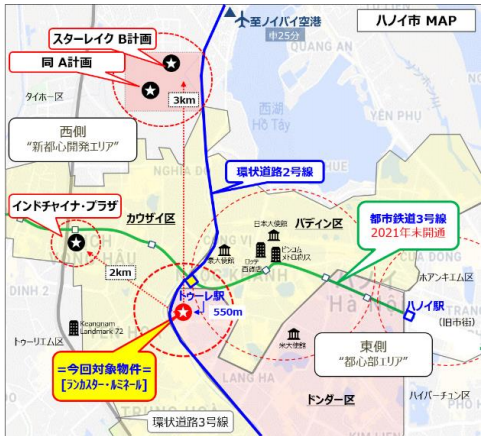このプロジェクトは、住宅・オフィス・商業から成る複合開発で、東に都心部「バディン区」、西に新都心「カウザイ区」との結節点となるエリアに位置する。交通アクセスも良いことから、今後外資系企業の進出などビジネス・商業エリアとしての発展が期待されているエリアだ。