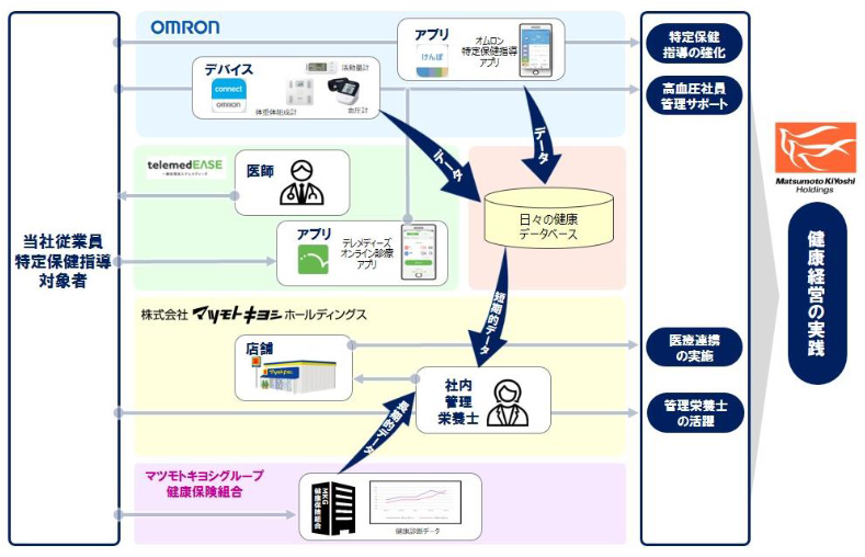 この保健指導に伴い、マツモトキヨシグループ健康保険組合は、被保険者に対し、オムロンヘルスケア(株)(京都府向日市、荻野勲社長)、一般社団法人テレメディーズ(東京都千代田区、谷田部淳一代表理事)と連携し、3社によるデジタルデバイスを活用した取り組みを実施する。