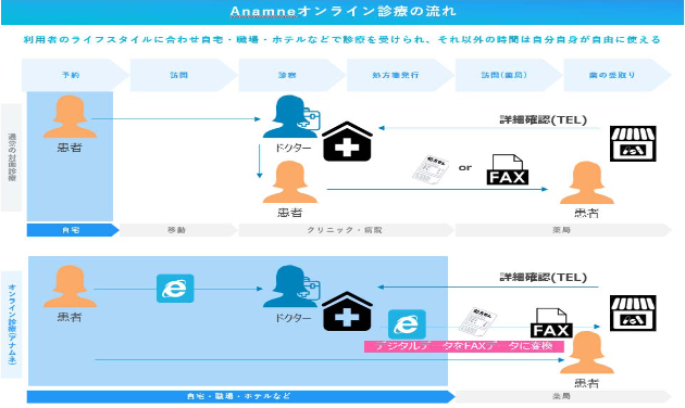 利用者(患者)は、必要事項とクリニック、受取り薬局を選択の後、自身が空いているスケジュールを選択・予約し、ビデオ通話で受診する。オンラインでの診療・決済の後、処方箋が登録した薬局に自動的に送信されるため、利用者は処方薬が用意できたタイミングで薬局に受け取りに行けばよい。最短で診療開始から1時間で薬を受け取ることができる。