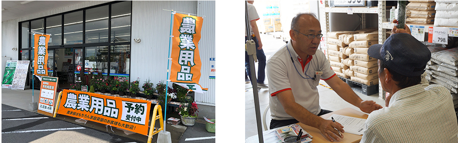 店舗では、農業用品予約相談会を実施して、農業アドバイザーなどのスタッフが、商品の提案やアドバイスを行う。農業アドバイザーは全国100名ほどいて、農作物の生育状況・確認、ドローンや水上ボードを活用するスマート農業といったさまざまなサポートを行っている。