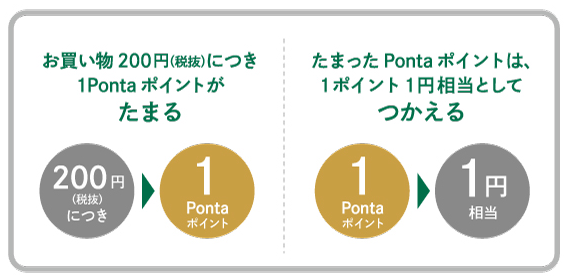 Pontaは買物金額に応じて「ためる」「つかう」ことができるポイントだ。買物200円ごとに1ポイントがたまり、1ポイントは1円相当として利用することができる。