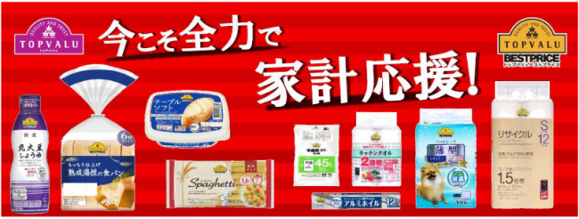 さらに、トップバリュ食料品以外のトップバリュ日用消耗品(紙製品、家事消耗品など)約1800アイテムも新たに価格据え置きアイテムとして加える。