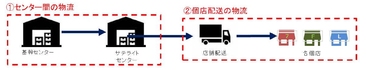 コンビニの物流では、多くの在庫を持つ基幹センターと遠隔地にあるサテライトセンター間で商品の横持ち配送が行われている。