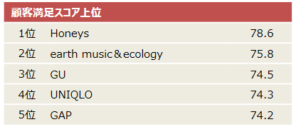 衣料品店業種は、1位Honeys、2位earth music&ecology、3位GU、4位ユニクロ、5位GAP。Honeysは、3年連続1位。