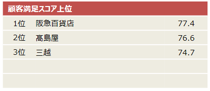 百貨店業種は1位阪急百貨店、2位髙島屋、3位三越。阪急百貨店は5年連続1位。