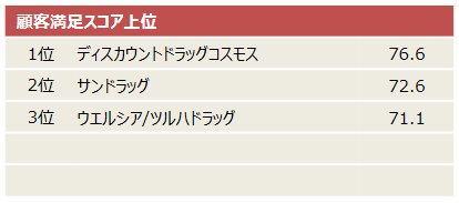 ドラッグストア業種は、1位ディスカウントドラッグコスモス、2位サンドラッグ、3位はウエルシアとツルハドラッグ。ディスカウントドラッグコスモスは11年連続1位。