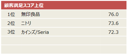 生活用品店/ホームセンター業種は、1位無印良品、2位ニトリ、3位はカインズとSeria。無印良品は2年連続1位。
