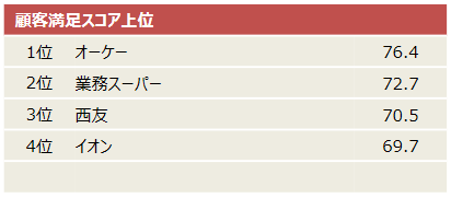 スーパーマーケット業種は、1位オーケー、2位業務スーパー、3位西友、4位イオン。オーケーは2011年度に調査対象となってから、11年連続の1位。