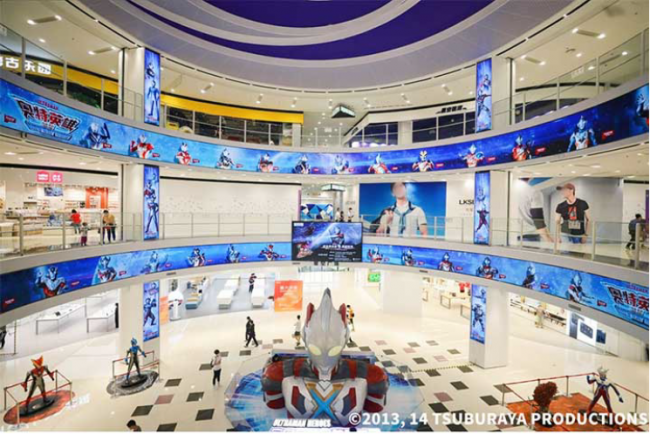 <イオンモール広州新塘(こうしゅうしんたん)の360°取り囲むLEDビジョン>