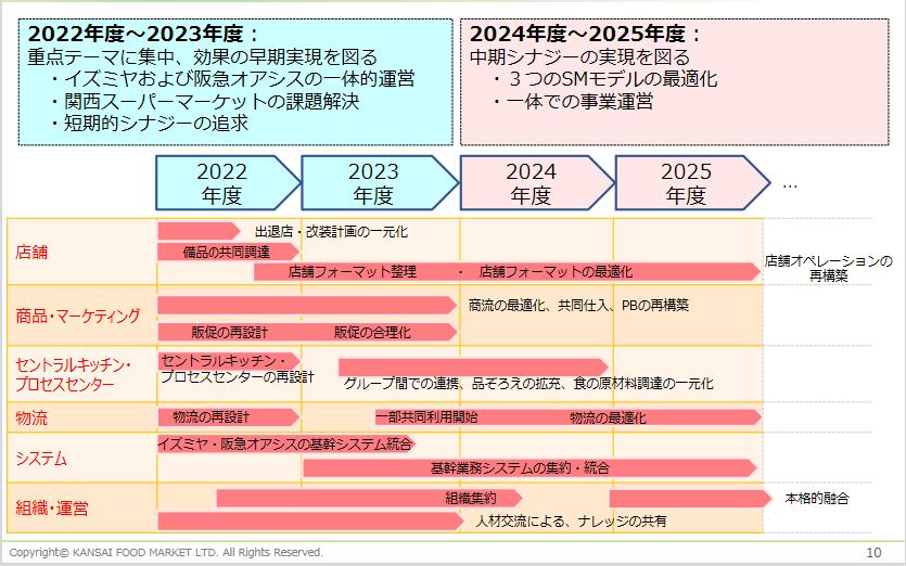 2022年度から2023年度は、各社の役割の明確化、総合的な中期計画の再構築、予算の合同策定による各政策の一元化、出店・改装計画一元化、備品・資材の共同調達などを進める。2024年度から2025年度には、組織の再編による本社本部機能の統合、インフラの再編計画策定、新基幹システムに統合、人事制度の統合を目指す。