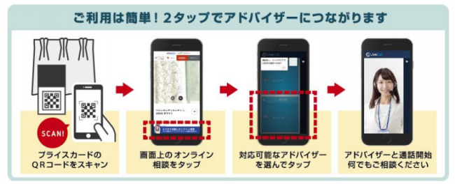 1つ目。スマートフォンで自宅から気軽にカーテンメーカーのアドバイザーに相談できる。