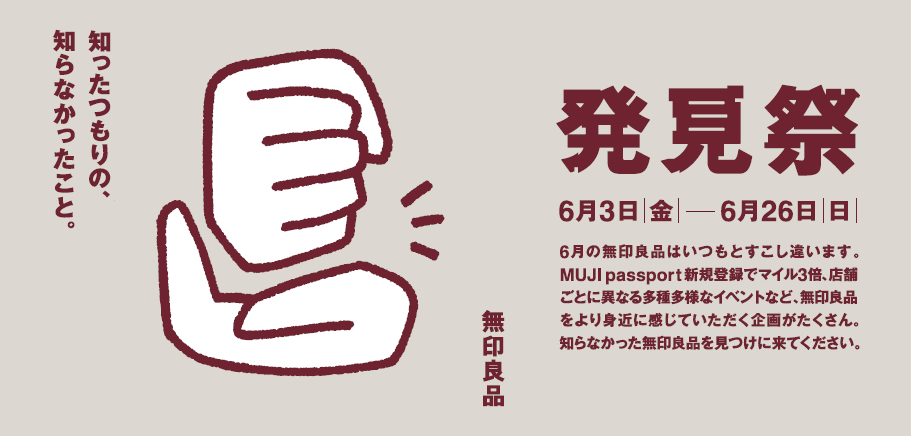 (株)良品計画(東京都豊島区、堂前宣夫社長)は6月4日を「ムジの日」とし、6月3日(金)から6月26日(日)の約1カ月間、無印良品の商品・サービス・取り組みを発見、体験してもらう「発見祭」を全国の無印良品店舗で実施する。