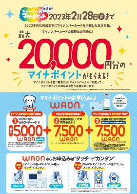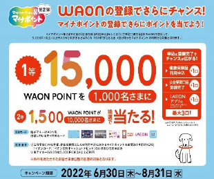 イオンは 6月30日(木)~8月31日(水)の期間、マイナポイント事業に申し込んだ「WAON」(WAON付帯のカードを含む)で5000円以上利用し、「健康保険証としての利用申し込み」もしくは「公金受取口座の登録」を行った人を対象に抽選でWAON POINT が当たるキャンペーンを実施する。