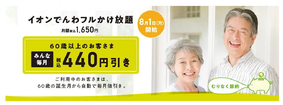 60歳以上の契約者で、すでに「イオンでんわ フルかけ放題」に加入している場合も一切の手続きは不要で、8月利用分から自動的に値引き料金となる。また、現時点で60歳未満の契約者に関しては、60歳になった誕生日月から自動的に値引き対象となる。