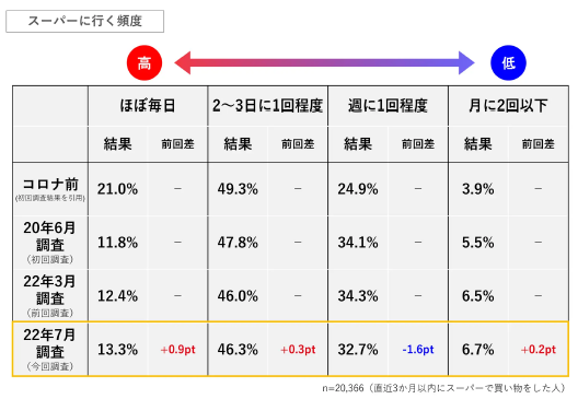 「直近3か月以内にスーパーに行った」と回答した人(n=2万0366)を対象に、まずはスーパーに行く頻度について質問した。「ほぼ毎日」が13.3%で、前回の2022年3月調査から0.9ポイント上昇した。これは、調査を開始した2020年6月以降、2020年10月調査と11月調査に記録した13.3%と並ぶ最高タイ記録。13%を超えたのは2021年7月調査(13.0%)を含め計4回で、今回1年ぶりに13%を越えた。「2~3日に1回程度」は0.3ポイント増加、やや頻度の少ない「週に1回程度」は、1.6ポイント減少した。