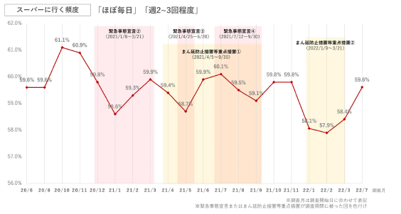 また、スーパーに行く頻度が高い「ほぼ毎日」「週2~3回程度」を合算した割合を初回の2020年6月調査から最新調査まで見てみると、緊急事態宣言やまん延防止等重点措置といった行動制限の有無によって数値が変化していることが分かる。最新調査では行動制限がなく、まん延防止等重点措置期間中だった前回の3月調査から1.2ポイント上昇した。