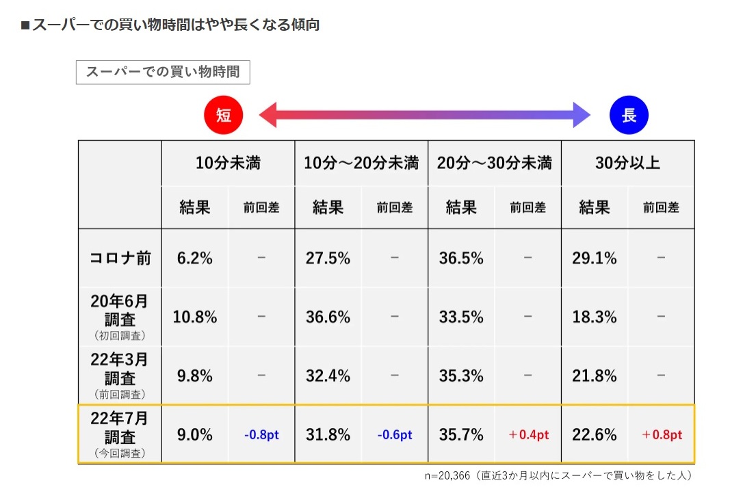これまでの調査結果から、買物頻度・時間と非計画購買派の増加が見て取れた。これは緊急事態宣言やまん延防止等重点措置による行動制限がなかったことに加え、「物価上昇」の影響を受けていることが自由回答から分かった。「物価が上昇しているため、余計な物は買わないように事前に決めてから買いに行く」(60代以上・男性)など今まで以上に計画的になったという人がいる一方で、「物価が高いので厳選して買物するため時間がかかる」(60代以上・女性)、「物価が高くなって安いところを探して複数店舗を回ったりして余計に時間がかかる」(40代・女性)など物価上昇が原因で買物時間が長くなっているとするコメントが多かった。