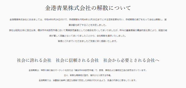 金港青果news | 今年11月末で会社解散/同社HP上で発表