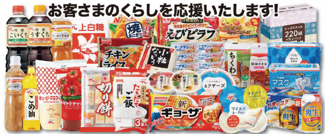 食料品は(一般食品・日配品・ハム類)で、ドリンク・酒類、菓子・スナック・おつまみ、調味料、米・麺類・シリアル・粉類、乾物・缶詰・インスタント食品、冷凍食品・レトルト・総菜、チーズ・乳製品、豆腐・納豆・漬物、パン・スイーツ・コーヒー・豆乳、ハム・ウィンナー・チキンナゲットなど。くらしの品は日用品、キッチン用品、掃除用品など。