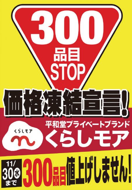 (株)平和堂(滋賀県彦根市、平松正嗣社長)は、日本流通産業(株)(大阪府大阪市、大桑弘嗣)と共同開発したプライベートブランド(PB)「くらしモア」の食料品・くらしの品の300品目を、10月1日(土)から11月30日(水)まで、価格を凍結することを宣言すると発表した。