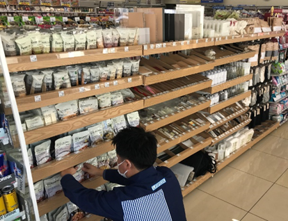 生活の基本となる化粧水、文具、靴下、レトルトカレー、菓子などの商品約200アイテムを、専用の販促物を使用した複数にわたる棚で展開する。店舗の立地や顧客の要望に合わせて、商品ラインナップの拡充を協議する。