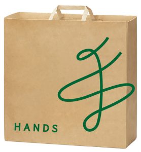デザインオフィス nendoのチーフデザイナー佐藤オオキ氏が手掛けた。「手」をモチーフに、日本発のグローバルなメッセージとして、 あえて漢字を使用しているのが特徴だ。一方で、 過去を継承しつつ未来へ向けてアップデートをしていくという想いから、 カラーは従来の「ハンズグリーン」を踏襲している。さらに端部をつなぎ合わせ、 途切れることのない「一筆書き」とした。