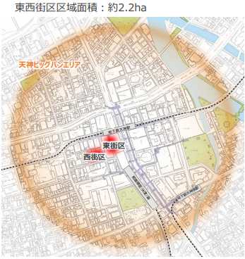 プロジェクトの東⻄街区区域⾯積は約2.2ヘクタール。東街区は約7900㎡でパルコ本館、パルコ新館などから成り、⻄街区は約5900に新天町商店街がある。いずれも建物の老朽化が進んでいる。