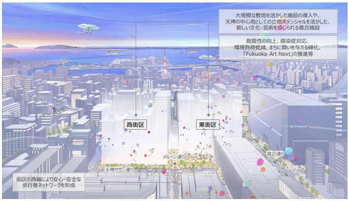 協議会では、1.歩⾏者と⾃動⾞が交錯する交通環境の改善、2.駅前の滞留と賑わい・憩い空間不⾜の解消として細分化されている街区の再編を⾏う。また広場や安⼼・安全な歩⾏者ネットワーク(地上の貫通通路や地下通路、上空通路等)、駐⾞場共⽤⾞路の東⻄接続などについて、東⻄街区が共働して整備を⾏うことで、複数街区にまたがる、段階的および連鎖的なプロジェクトを⽬指していく。さらに商店街・商業施設を低層部に形成し、天神の中⼼地としての⽴地ポテンシャルを活かした、新しい⽂化・芸術を感じられる複合施設を⽬指していく。