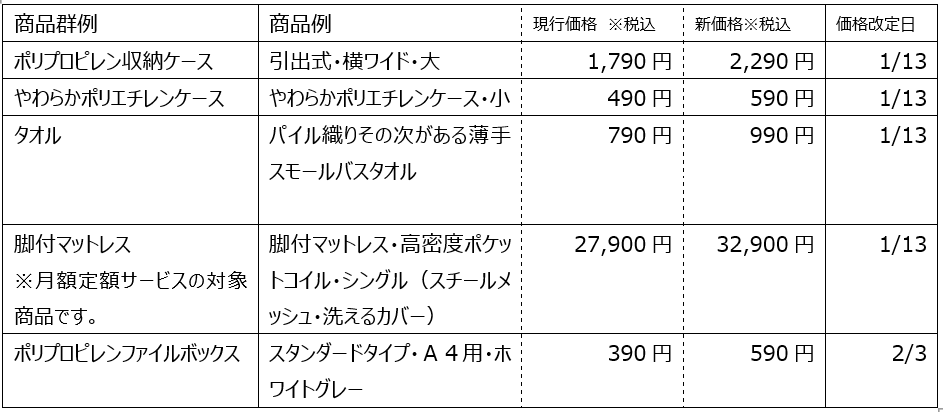 また価格改定を行うにあたり、物価高騰のなかでの厳しい日常生活への対応や、地球環境対応を含む、未来に向けた生活や商品の在り方を考え、「家具の月額定額サービスの本格化」「プラスチック商品のリユース・リサイクル・代替素材商品への100%移行推進」「価格改定前と同一価格での代替新商品の開発、販売」を行っていく。