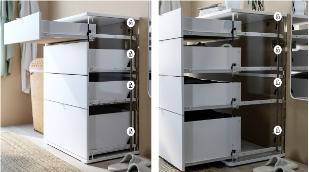 世界で初めてアンカー&アンロック機能を搭載したイケア製品は、「VIHALS/ヴィーハルス チェスト」がある。