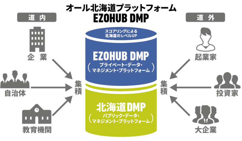 また、オール北海道プラットフォーム「EZOHUB DMP」では、北海道にまつわるさまざまな情報を集積したデータベースを構築する。データベースはパブリックデータから、自治体ごとの課題、道内企業が求める人材要件、新しいことに前向きなタレントの情報など、多岐に渡る。北海道で50年以上ビジネスを行い、自治体や企業、団体、教育機関など40以上の協定を結んできたサツドラの「つなぐ力」を北海道の力として活用する。