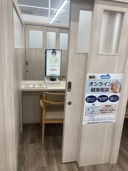 店舗内に専用ブースを設置し、情報通信機器を活用して看護師と相談者間でオンライン健康相談(遠隔健康医療相談)を行う。相談者は店舗内のブースに設置された専用PCから、医療法人社団ゆみのの看護師を中心とした医療スタッフに相談し、一般的な医学的な情報の提供や受診勧奨を受けることができる。