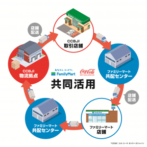 このスキームは、コカ・コーラ ボトラーズジャパンの店舗配送トラックが稼働していないときに、ファミリーマート店舗への常温商品配送に使用することで、同一車両を2社で有効活用するというもの。