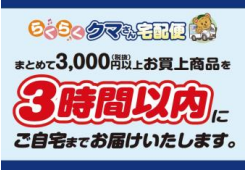 「らくらくクマさん宅配便」はまとめ買いをしたいが持って帰ることができない、買物帰りに他の用事も済ませたい、もっと気軽に宅配便を利用したいといった要望に対応する、配達サービスである。合計3000円(税抜、以下同)以上購入すれば、3時間以内に自宅まで届けることができる。常温品、冷蔵品、冷凍品(アイスクリーム・氷は除く)を折りたたみコンテナ5個分まで配送が可能。
