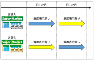なお、鮮度表示のタイミングを実施する2店舗でずらして交互に実施することにより、それぞれの店舗の地域性や季節性を加味した効果検証が可能となる。鮮度表示を行う魚種は仕入れ状況を勘案しながら決定するが、鮮度の良い商品に対しては、それを表すラベルを貼付することで、水産物を「当たりはずれが少ない」商品として販売することが可能となる。