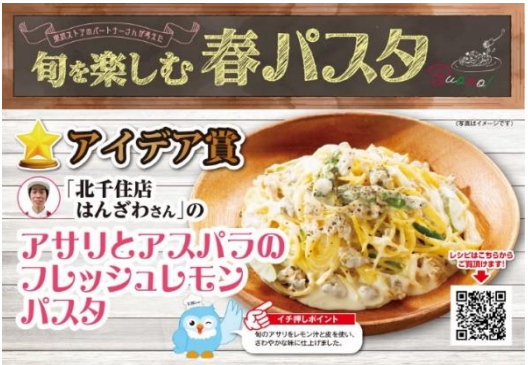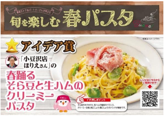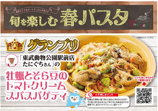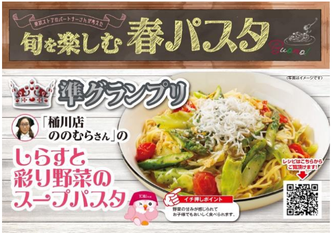 受賞した4名のパスタレシピは、4月12日(金)から東武ストアのホームページおよび4/12号チラシに掲載される。