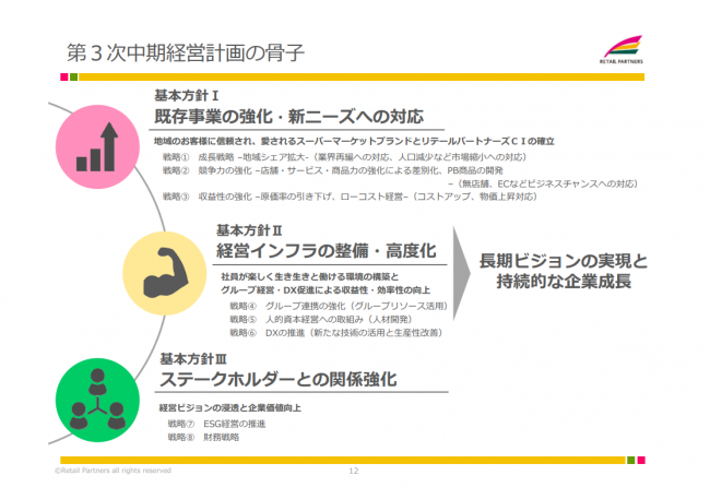 2015年に持株会社としてスタートしたリテールパートナーズは、2017年に(株)マルキョウと経営統合して現体制になった。翌2018年から中期経営計画を策定してきた。