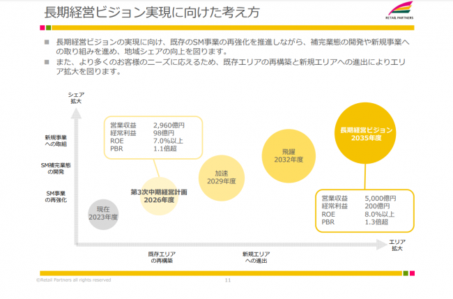 新しい中期経営計画では「2035年度、『地域の多様なニーズに応え幸せを創出する』」を掲げて、九州・中国から近畿地⽅までの⻄⽇本で、5000億円規模のローカル流通グループを目指している。